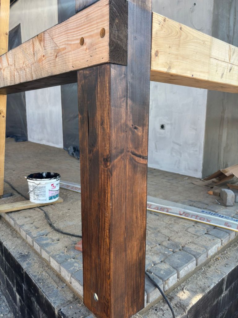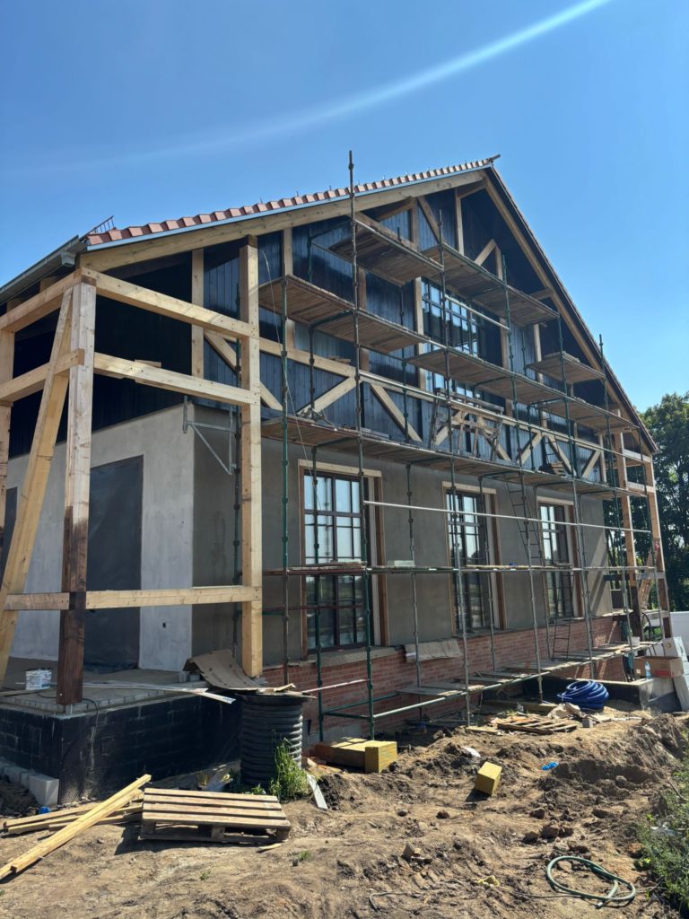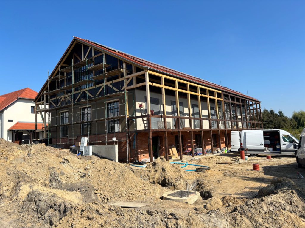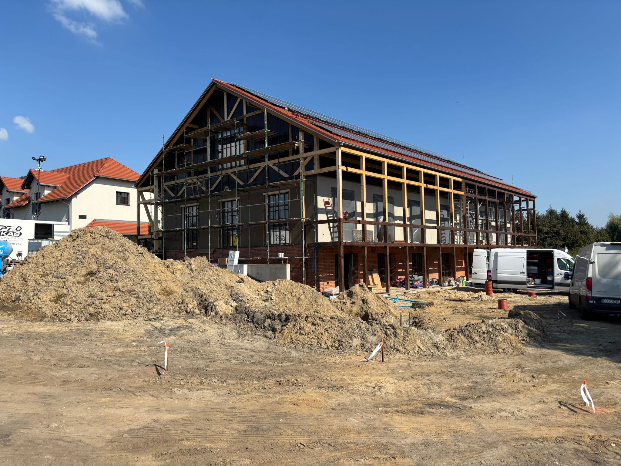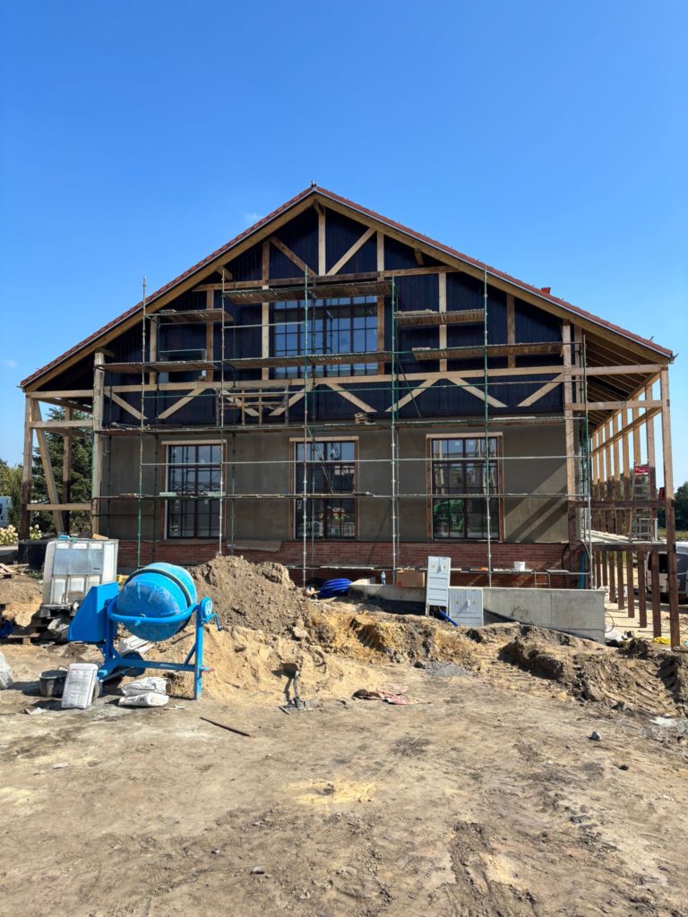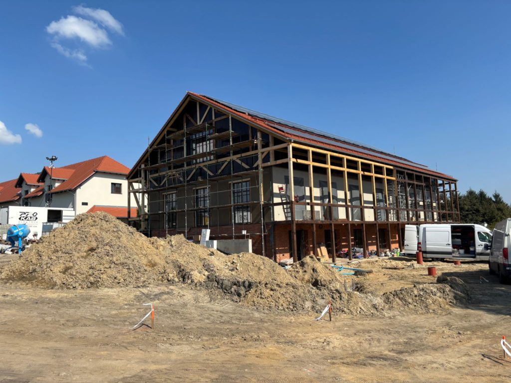 Na głównym obiekcie trwają prace elewacyjne – oprócz tynkowania pojawiły się drewniane elementy dekoracyjne, belki i podpory, które nadają bryle wyjątkowego, eleganckiego stylu. Dodatkowo na dachu widać już zamontowaną instalację fotowoltaiczną, która w przyszłości pozwoli na bardziej ekologiczne i oszczędne funkcjonowanie całego kompleksu.