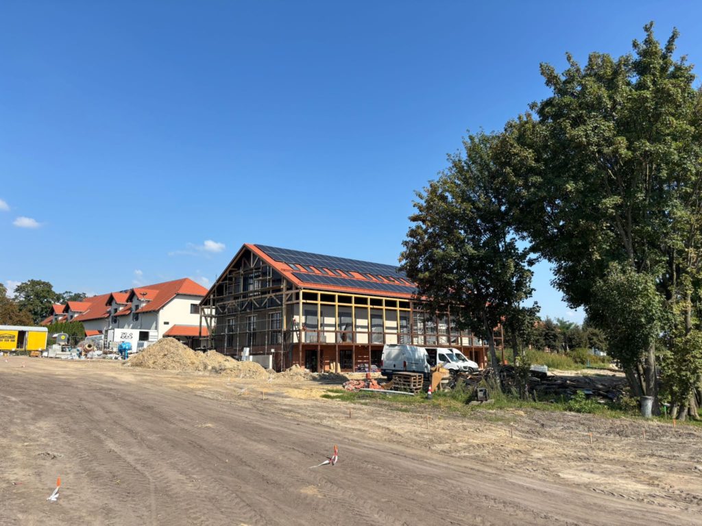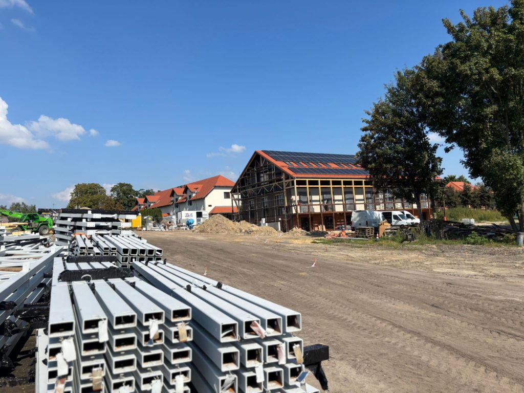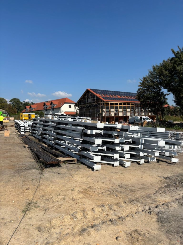Na placu budowy widoczne są również przygotowania do nowej przestrzeni treningowej – rozpoczęła się budowa ujeżdżalni dla koni, a także montaż stelaży pod halę, która stanie się jednym z centralnych punktów ośrodka.